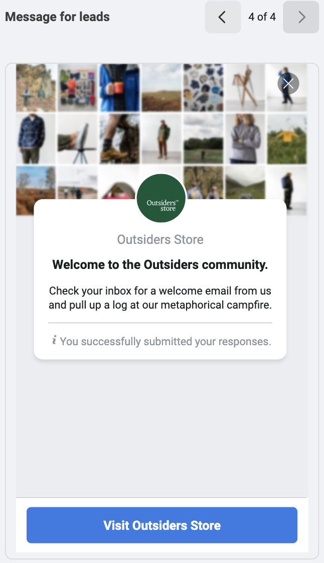 Email lead ads are a slower, steadier approach for Outsiders Store’ advertising strategy. Building your email list takes time but by increasing their subscribers, Outsiders could leverage more return from the work they were putting into their creative and long form projects.